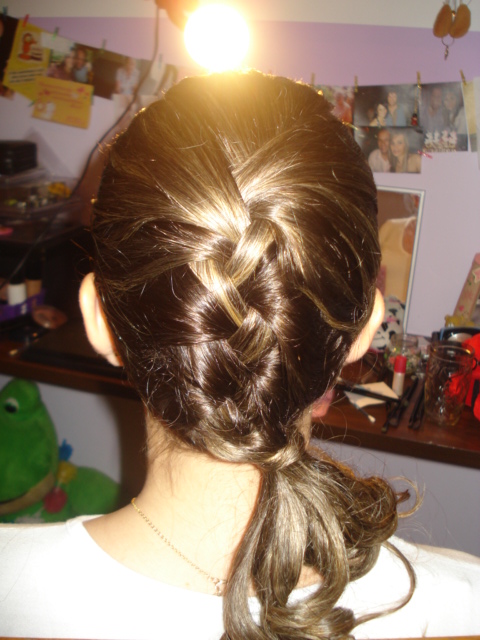 o cabelo uma trança embutida, terminei na nuca e fiz uns cachos.