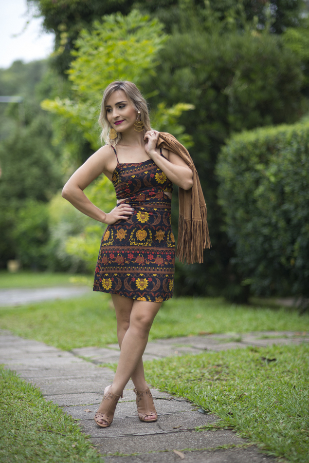 Optei por um vestido em tons terrosos, estampa étnica e com essa abertura na lateral que deu um super charme. Para compor o look um colete de Suede com franjas, confesso que não sou muito fã de franjas mas esse eu amei demais.